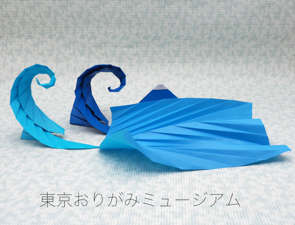 北斎の絵には、こどもの頃から憧れていて、武者絵の模写などしたものです。さて、先年「風」「水」などをおりがみで表現してみたい野心を試みた中、潜在する北斎への憧憬が、こんな風景構成をさせてくれました。